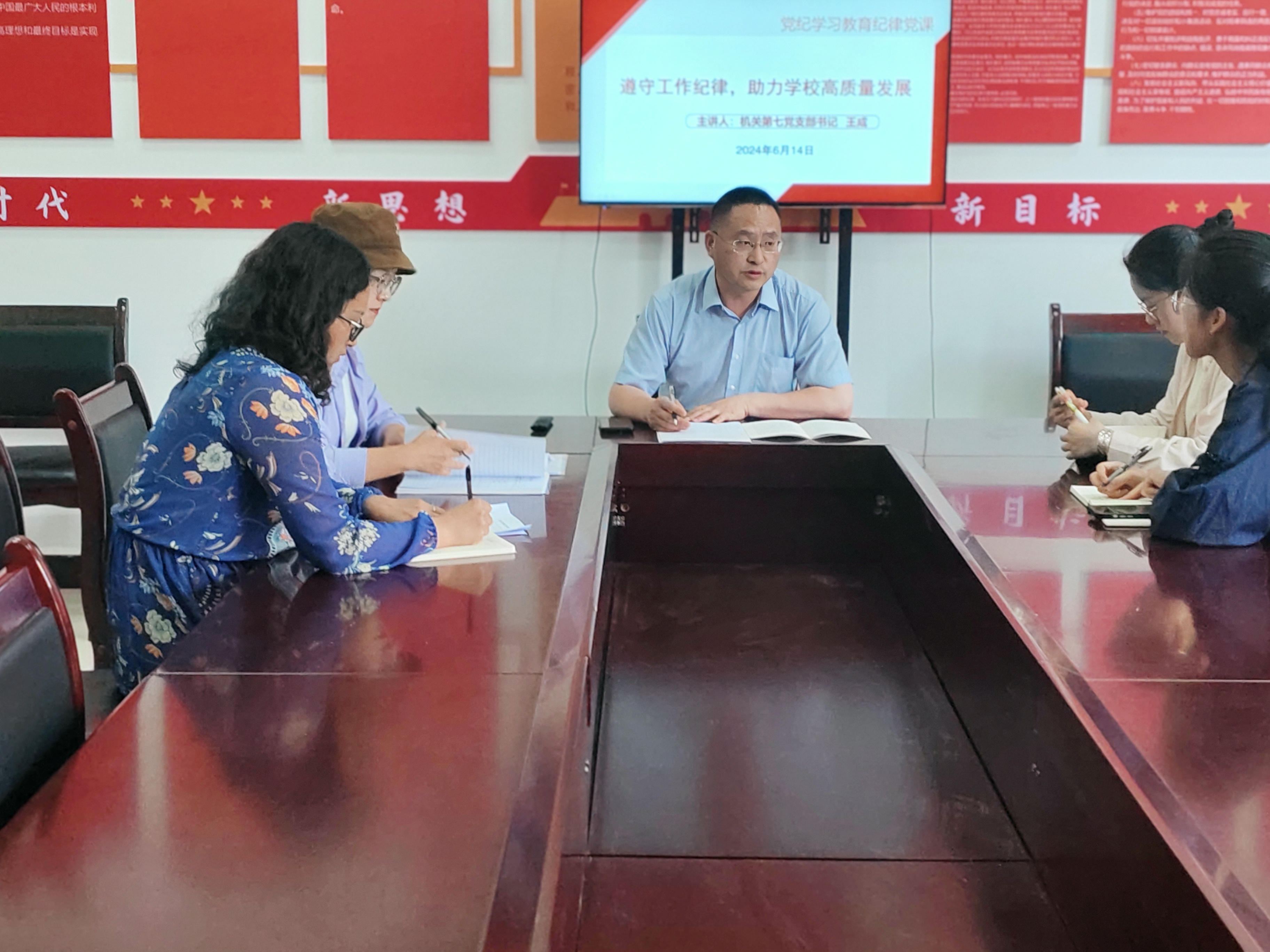 2024年6月14日上午,机关第七党支部书记王成同志在校务管理中心201讲授题为《遵守工作纪律,助力学校高质量发展》的专题党课,机关第七党支部全体党员参加了党课。