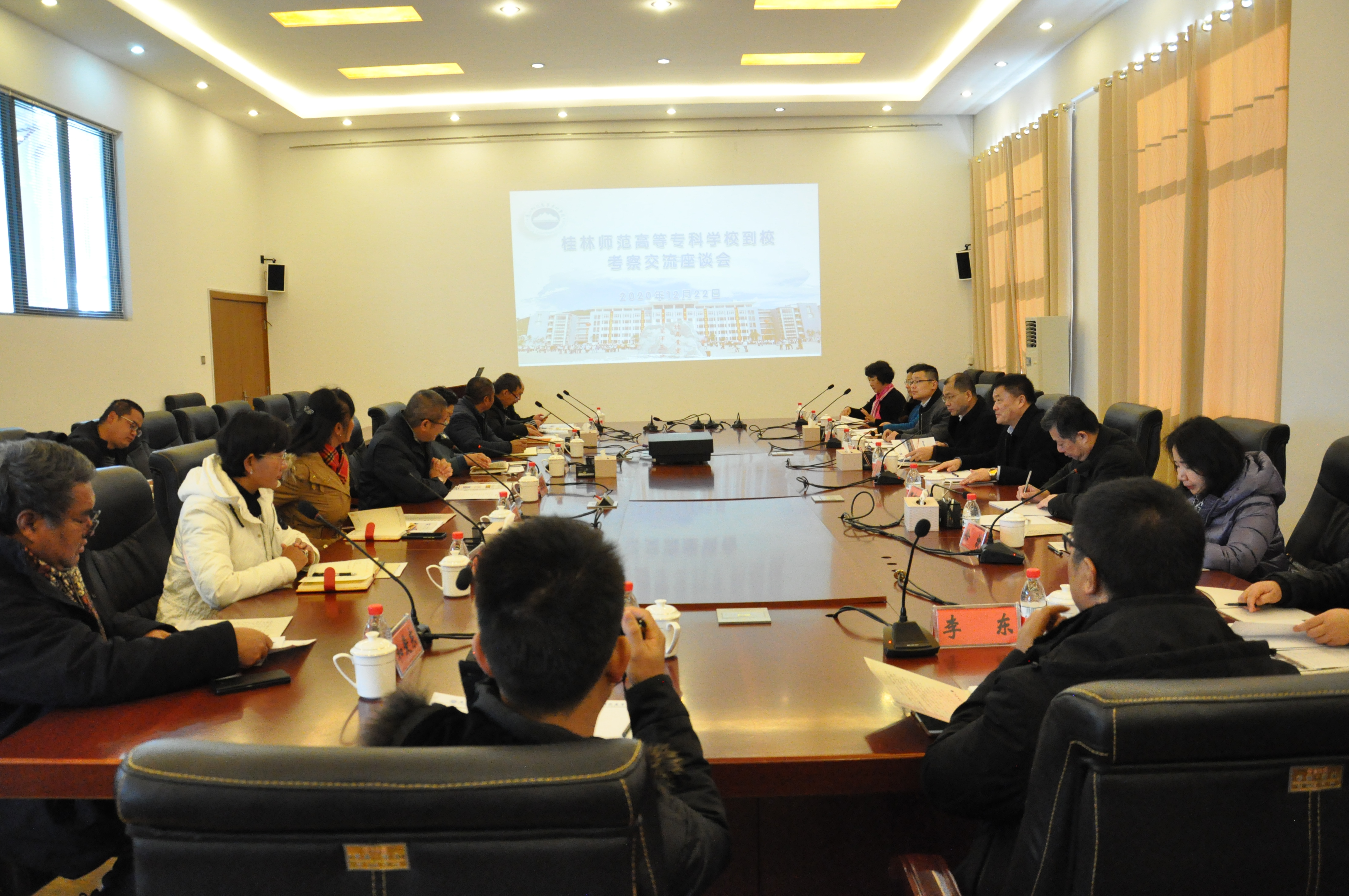 12月22日上午,桂林师范高等专科学校党委书记王源平、校长陈慕杰一行10人到我校考察交流。在我校党委书记张祖武的陪同下,王源平书记一行实地走访了我校高山植物标本馆、学前教育实训中心、英力克实训中心、滇西北民族艺术传承基地。