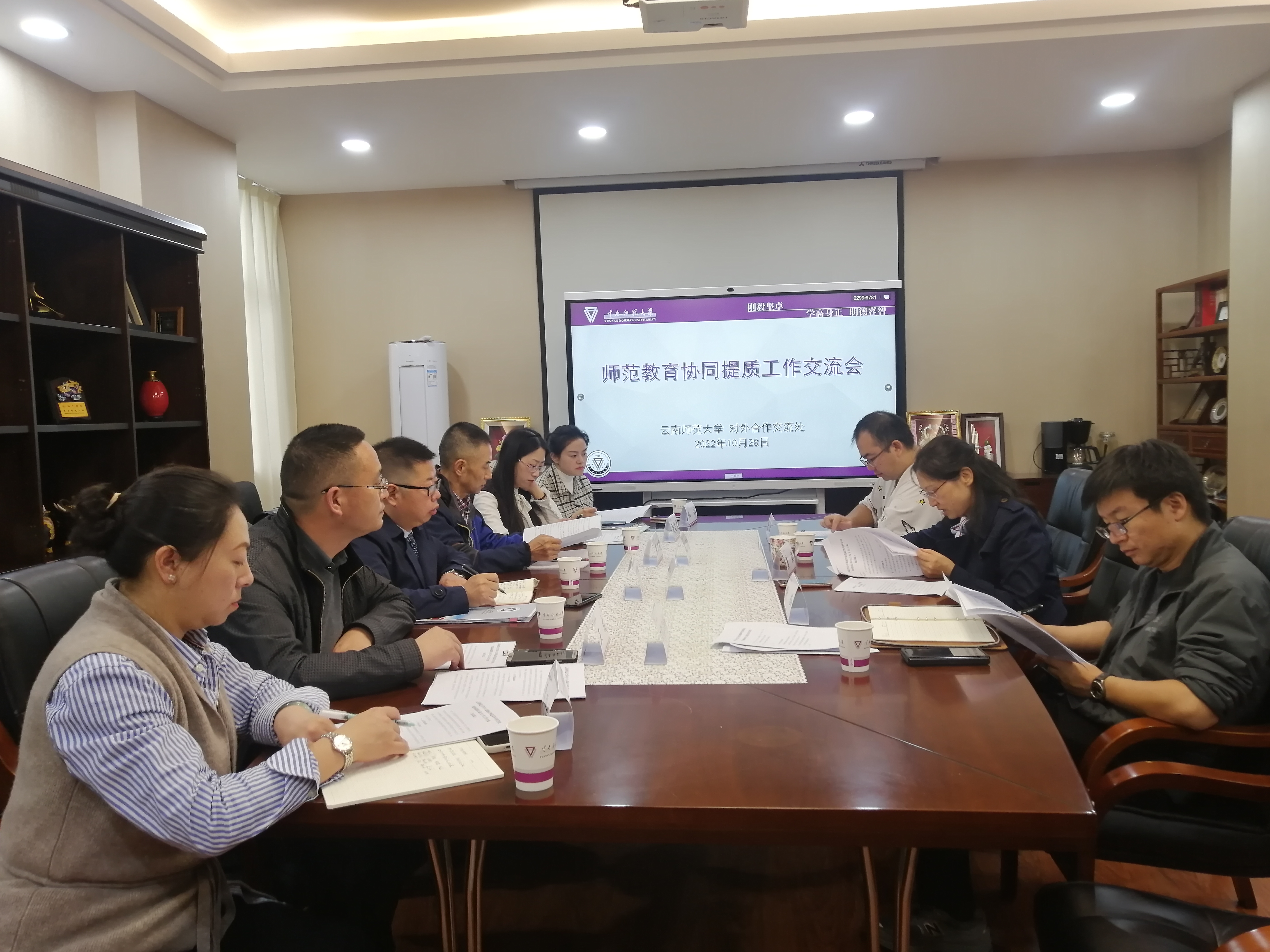 2022年10月28日,师范教育协同提质工作交流会在云南师范大学呈贡校区召开。本次会议由云南师范大学对外合作交流处组织,丽江师专、保山学院、昭通学院三所院校的对外合作交流部门参加了会议。我校对外合作交流中心主任王成率部门同志参加了会议。