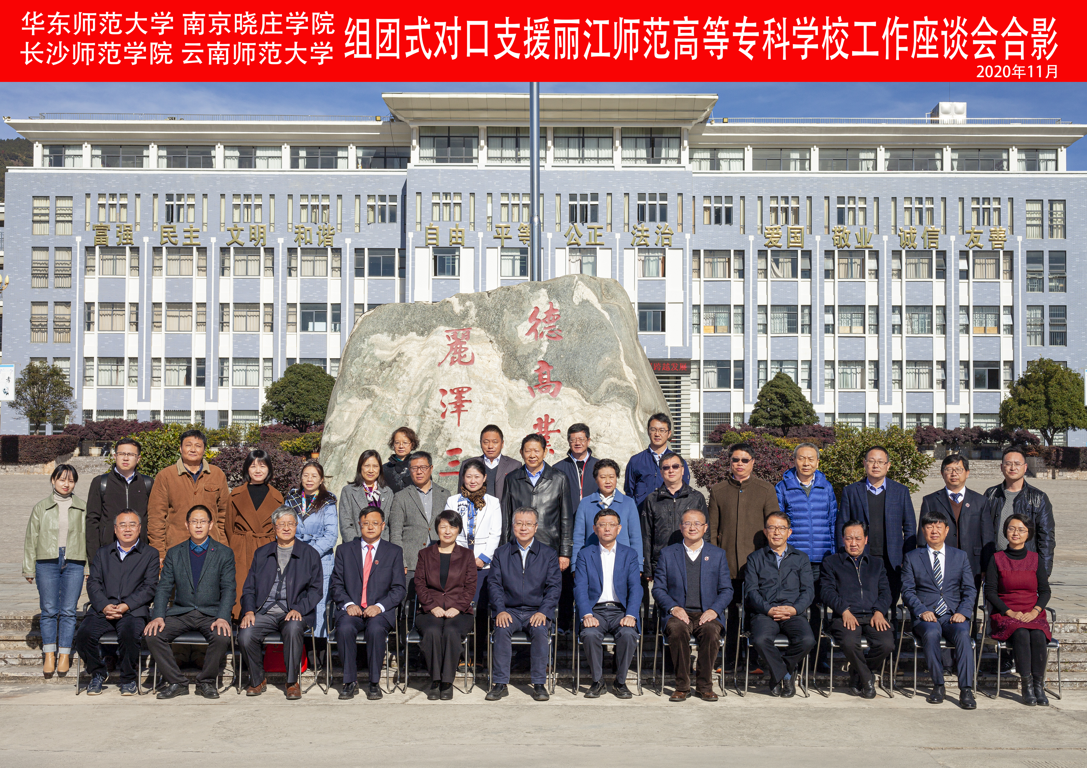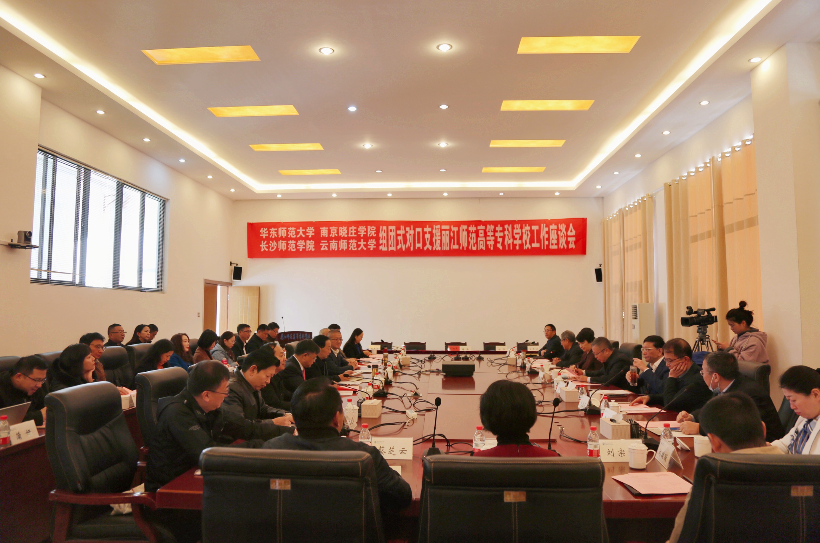 按照党中央打好脱贫攻坚战、助力乡村振兴战略实施的总体部署和教育部巩固教育脱贫攻坚成果、推进乡村振兴的明确要求,为加大对丽江教育支援力度,根据教育部安排,由华东师范大学牵头,协同南京晓庄学院、长沙师范学院、云南师范大学组团式对口支援丽江师范高等专科学校。11月27日上午,华东师范大学、南京晓庄学院、长沙师范学院、云南师范大学对口支援丽江师范高等专科学校工作座谈会在我校第三会议室召开。