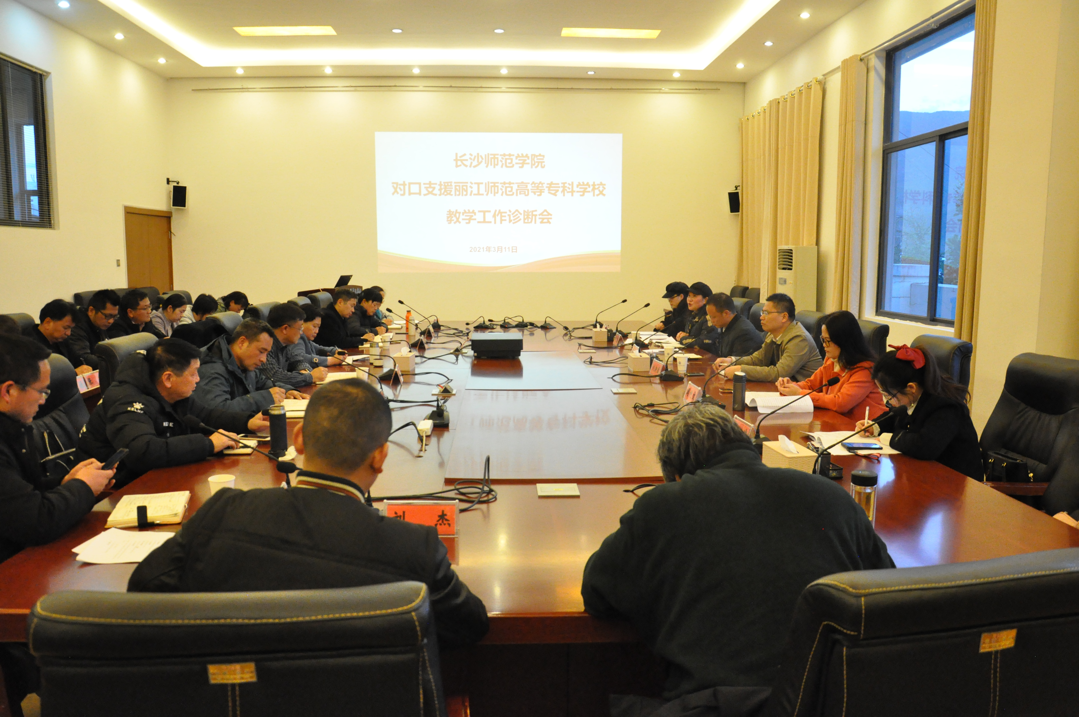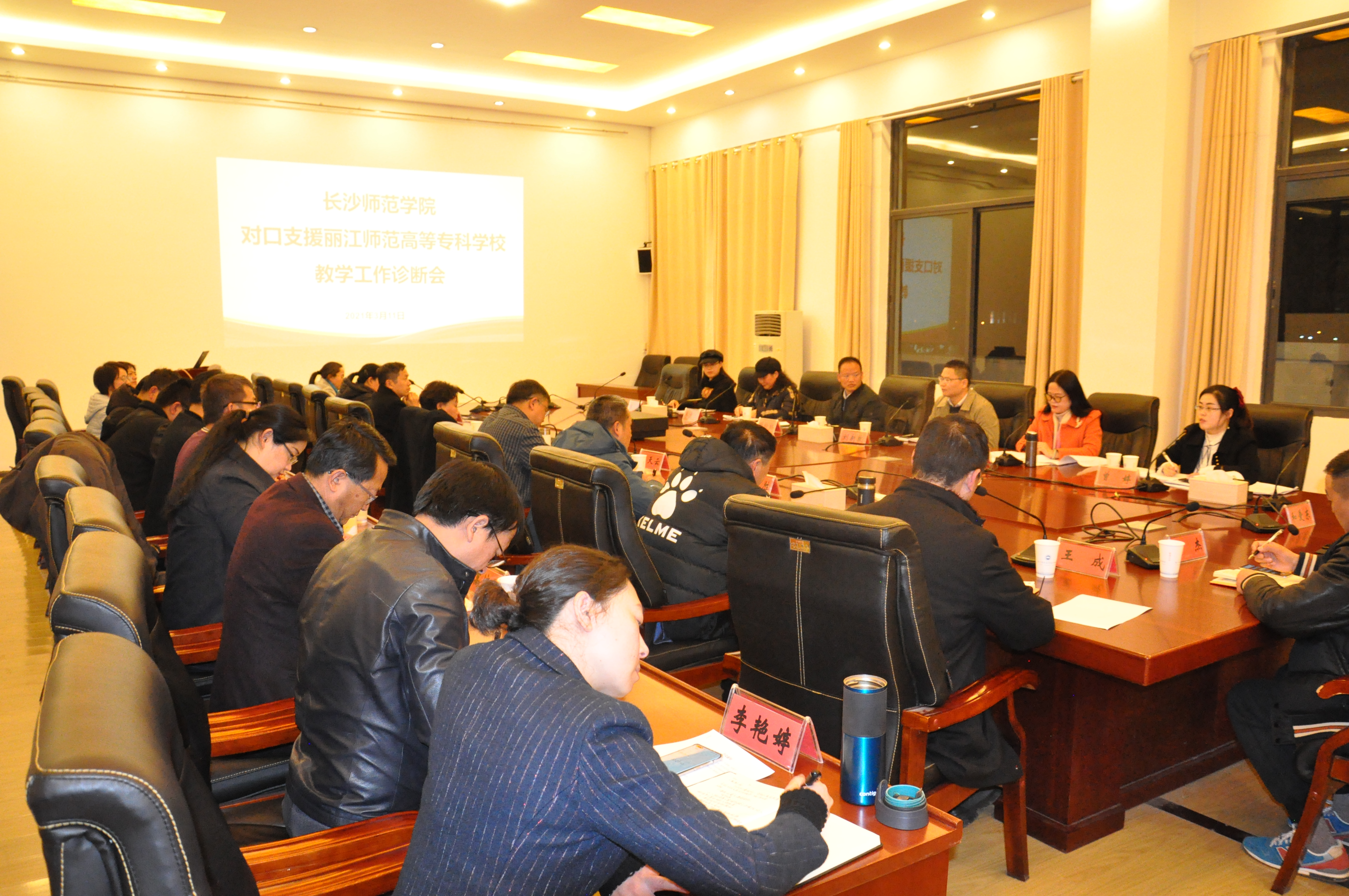 为贯彻落实长沙师范学院对口支援我校工作部署会暨课程建设座谈会议精神,3月11日晚上7点,长沙师范学院对口支援丽江师范高等专科学校教学工作诊断会在学校第三会议室召开。长沙师范学院李京玉、谢松林、刘新敖、周利文、梁燕、曾婷等6位专家(丽江师专兼职教授)组成的对口支援专家团,丽江师专党委副书记、校长毕天云、副校长朱桂香、张兰胜,挂职干部张建国,各学院、相关部门负责人出席会议。会议由丽江师专校长毕天云主持。